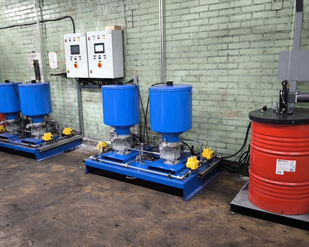 Установленная автоматическая двухлинейная система смазки обжиговой машины состоит из 2-х магистральных станций (HYMA Р246) ёмкостью 100 кг и электрической заправочной станции для заправки магистральных станций из бочки 180 кг. Каждая насосная станция обеспечена датчиком уровня. В случае опустошения магистрального насоса автоматически включится заправочная станция и заправит магистральный насос. Система смазки «HYMA» позволит полностью отказаться от ручного труда в процессе проведения смазочных работ и обеспечить надежную и качественную работу подключенных узлов трения обжиговой машины.